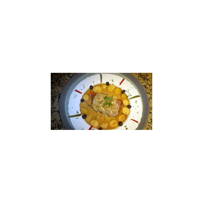 Entrecot a Portuguesa : white wine sauce, with garlic, topped with slice of smoked ham and cheese.