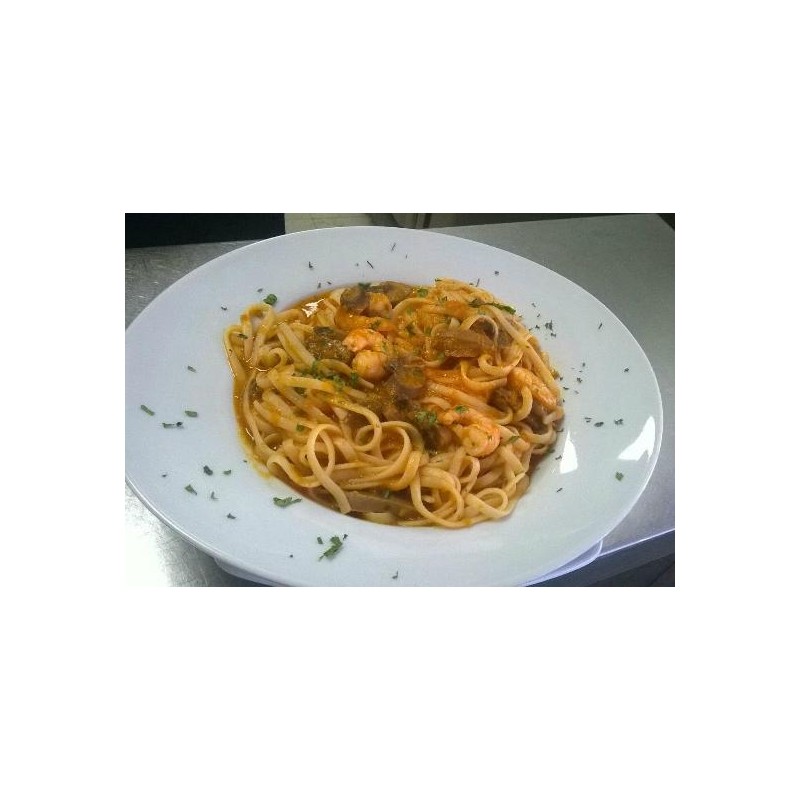 Espaguetis Mar Y Monte Gambas y Champinones.
